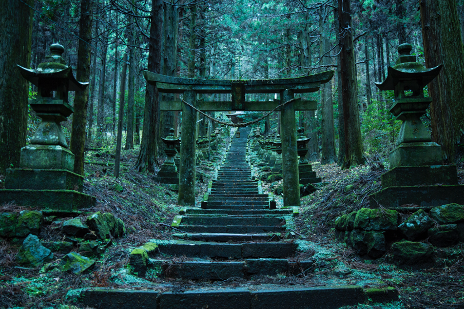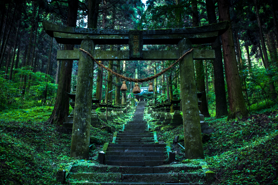 上色見熊野座神社は、「まるで異世界への入り口のようだ」とSNS上で話題になっている、森の中にひっそりとたたずむ神秘的な雰囲気の神社です。石の階段や鳥居、灯籠が緑色の苔に覆われており、そこに日光が差すことで、なんとも幻想的な光景が広がります。